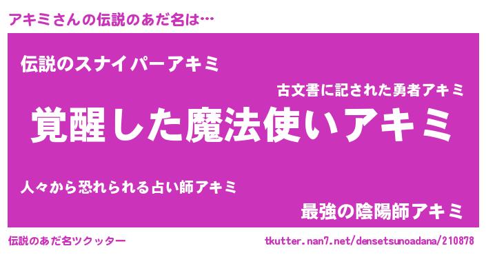 | 男性向けラノベタイトル風あだ名 | 『アキミの嫁は女の子じゃないと思った?』 |