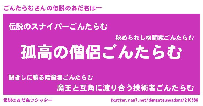 | 男性向けラノベタイトル風あだ名 | 『ダンジョンにごんたらむを求めるのは間違っているだろうか』 |