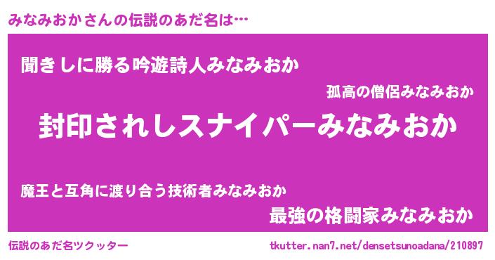| ヘコむあだ名 | 『みなっふぃ~』『みなみおか(笑)』 |