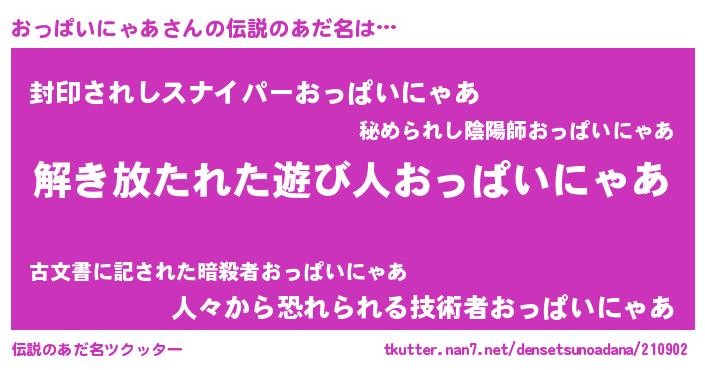 | 男性向けラノベタイトル風あだ名 | 『魔弾の王とおっぱいにゃあ』 |