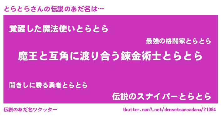 | 男性向けラノベタイトル風あだ名 | 『転生したらとらとらだった件』 |