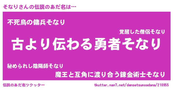 | 胡散臭い通販商品みたいなあだ名 | 『来世でも幸せになれる水素水…その名も「そなり」』 |