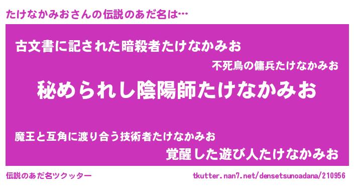 | 男性向けラノベタイトル風あだ名 | 『魔弾の王とたけなかみお』 |