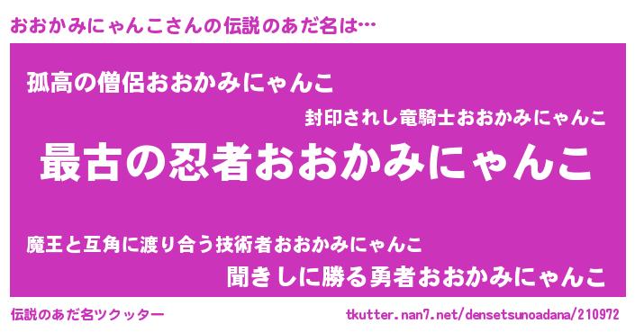 | 男性向けラノベタイトル風あだ名 | 『この素晴らしい世界におおかみにゃんこを!』 |