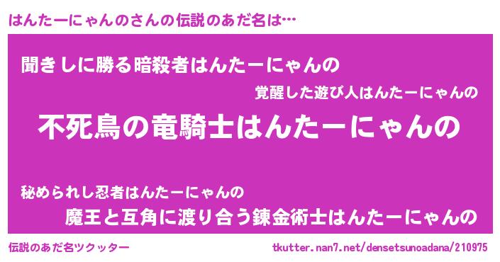 | ヒーロー風カッコイイあだ名 | 『仮面ハンダー』『ネオハンターニャンノ』 |