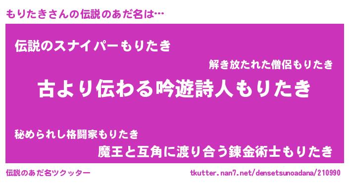 | 意味不明あだ名 | 『永久保存もりたき』『ペロリンもりたき』 |
