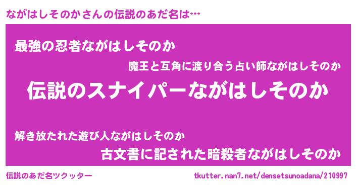 | 胡散臭い通販商品みたいなあだ名 | 『必ず成功する霊験あらたかなお札…その名も「ながはしそのか」』 |