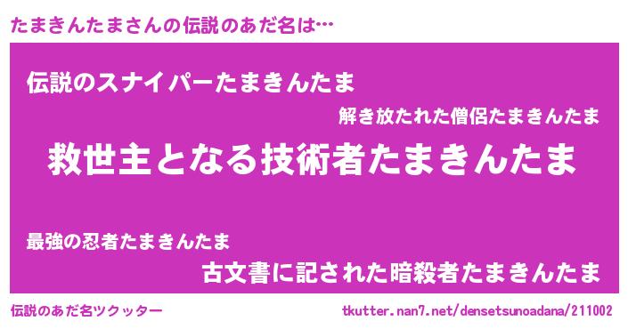 | 男性向けラノベタイトル風あだ名 | 『うちのたまきんたまが世界を掌握している!』 |