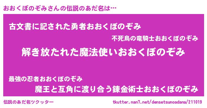 | ヒーロー風カッコイイあだ名 | 『魔戒騎士オオ』『ネオオオクボノゾミ』 |