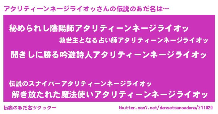 | 女子向けラノベタイトル風あだ名 | 『アタリティーンネージライオッアンティーク』 |