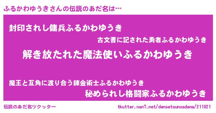 | 男性向けラノベタイトル風あだ名 | 『ふるかわゆうきの嫁は女の子じゃないと思った?』 |