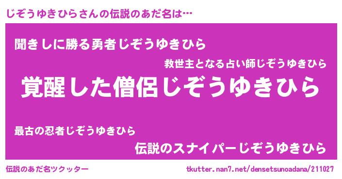 | 女子向けラノベタイトル風あだ名 | 『じぞうゆきひら様がみてる』 |