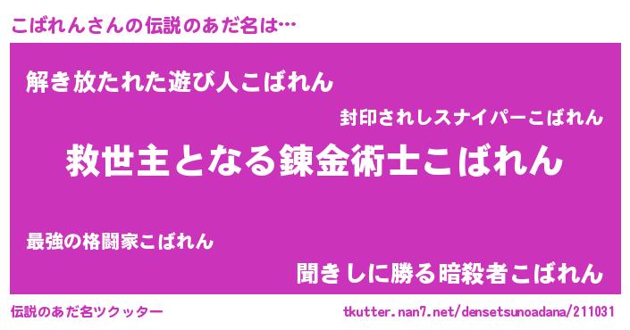 | 女子向けラノベタイトル風あだ名 | 『死神こばれんの再婚』 |
