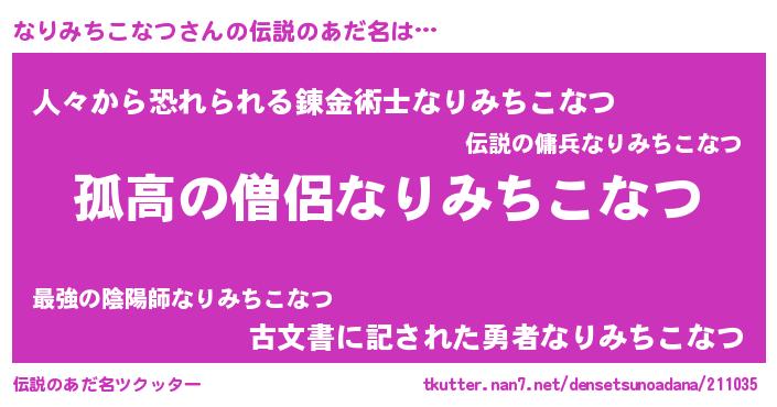 | ヒーロー風カッコイイあだ名 | 『暗黒騎士ナリ』『ネオナリミチコナツ』 |