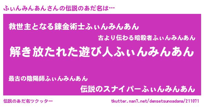 | 女子向けラノベタイトル風あだ名 | 『ふぃんみんあんの卵を拾いまして』 |