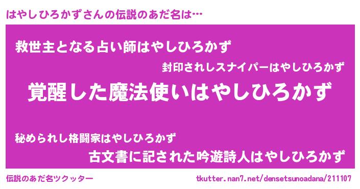 | ヒーロー風カッコイイあだ名 | 『天弓騎士ハヤ』『ネオハヤシヒロカズ』 |
