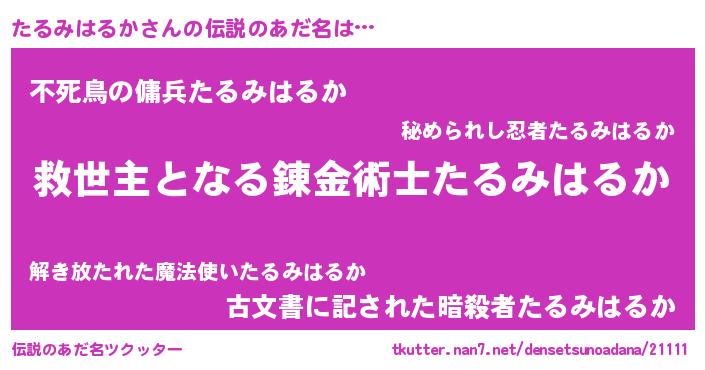 | 男性向けラノベタイトル風あだ名 | 『たるみはるか~年齢イコール彼女いない歴の魔法使い~』 |