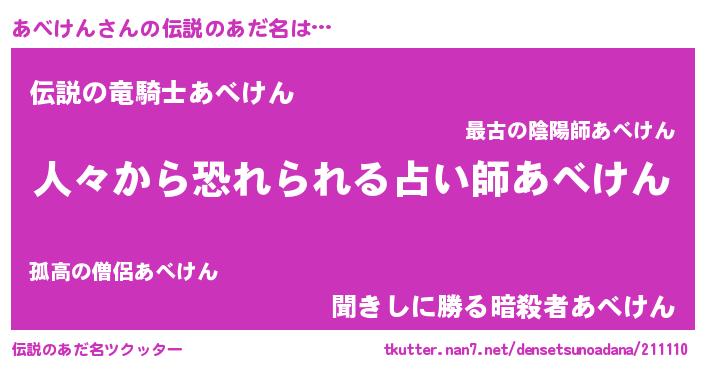 | 意味不明あだ名 | 『自称あべけん』『ペロリンあべけん』 |