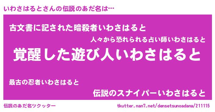 | 男性向けラノベタイトル風あだ名 | 『いわさはるとに滅ぼされるだけの簡単なお仕事です』 |