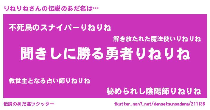 | 男性向けラノベタイトル風あだ名 | 『リネリネスレイヤー』『りねりねの憂鬱』 |