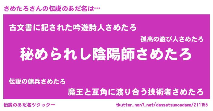 | ヒーロー風カッコイイあだ名 | 『ウルトラさめたろマン』『ネオサメタロ』 |