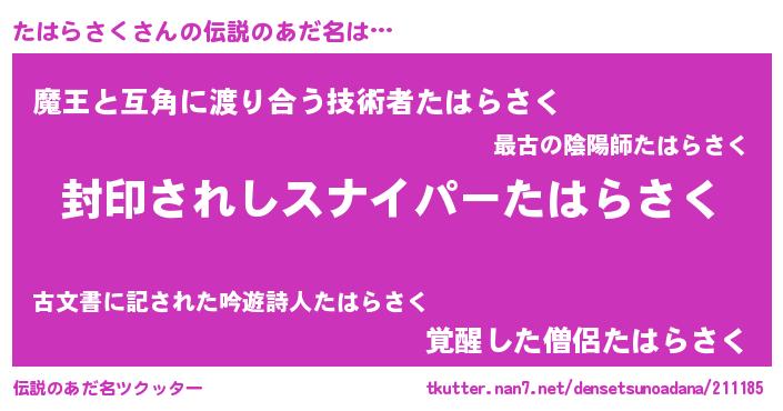| 男性向けラノベタイトル風あだ名 | 『たはらさく~年齢イコール彼女いない歴の魔法使い~』 |