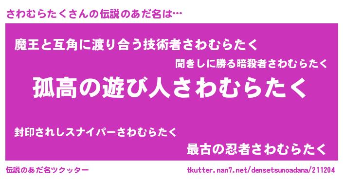 | 女子向けラノベタイトル風あだ名 | 『さわむらたくが死なない童話 林檎のさわむらたくの診療簿』 |