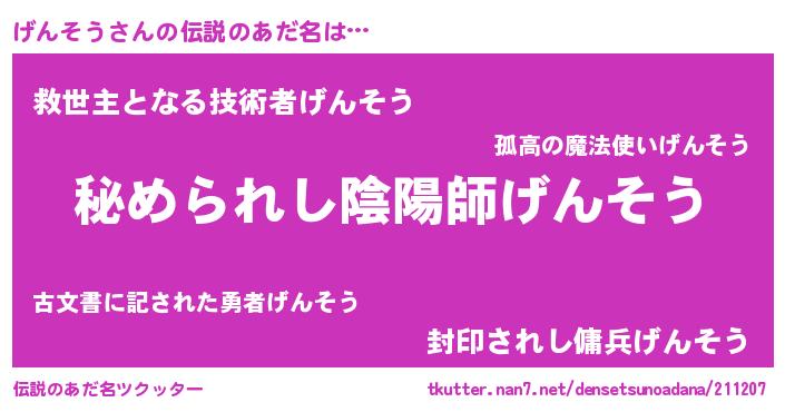 | 男性向けラノベタイトル風あだ名 | 『魔弾の王とげんそう』 |