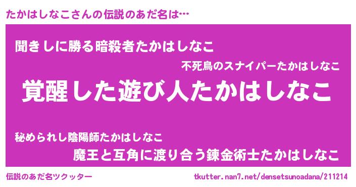 | ヒーロー風カッコイイあだ名 | 『最強戦士タカハシナコ』『暗黒騎士タカ』 |