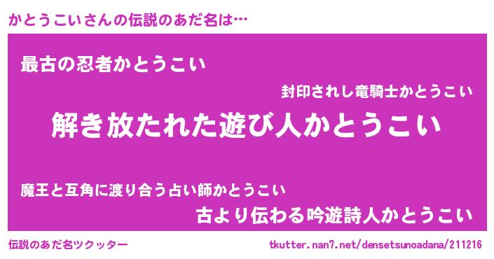 | 男性向けラノベタイトル風あだ名 | 『かとうこいの嫁は女の子じゃないと思った?』 |
