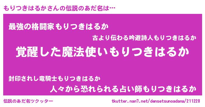 | 男性向けラノベタイトル風あだ名 | 『もりつきはるかの嫁は女の子じゃないと思った?』 |