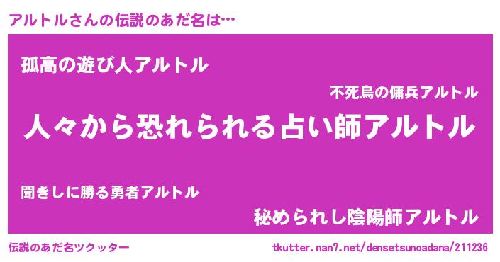 | 男性向けラノベタイトル風あだ名 | 『おまえをオタクにしてやるから、俺をアルトルにしてくれ! 』 |