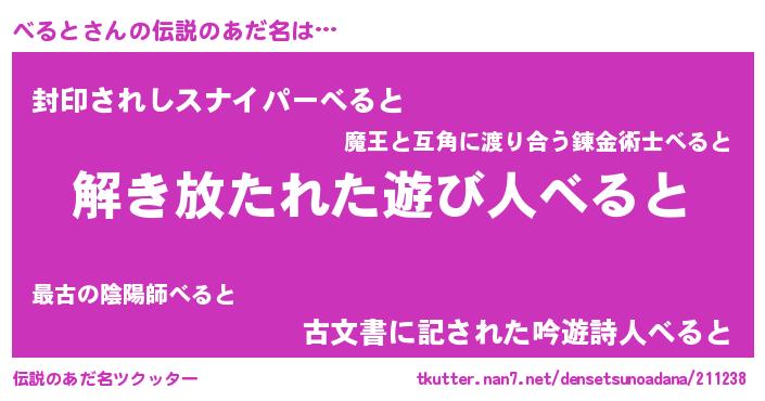 | 男性向けラノベタイトル風あだ名 | 『転生したらべるとだった件』 |