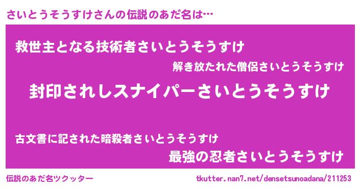 | ヒーロー風カッコイイあだ名 | 『スーパーサイトウソウスケ』 |