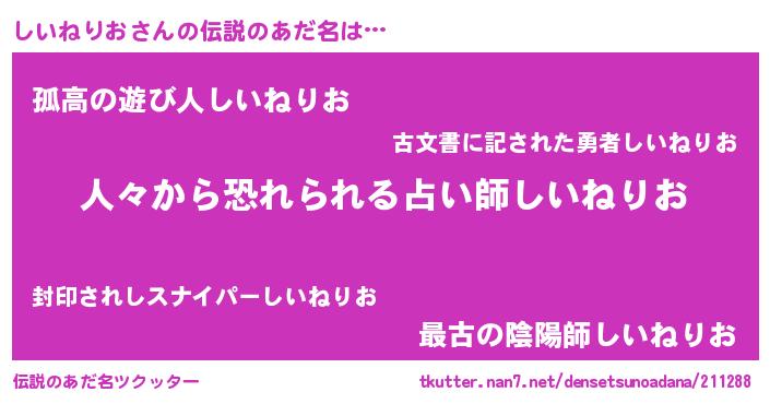 | 男性向けラノベタイトル風あだ名 | 『おまえをオタクにしてやるから、俺をしいねりおにしてくれ! 』 |