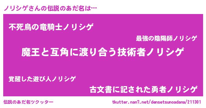 | 男性向けラノベタイトル風あだ名 | 『おまえをオタクにしてやるから、俺をノリシゲにしてくれ! 』 |