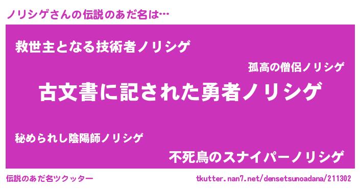 | 男性向けラノベタイトル風あだ名 | 『ノリシゲ~年齢イコール彼女いない歴の魔法使い~』 |