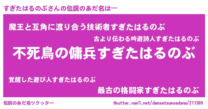 | 男性向けラノベタイトル風あだ名 | 『魔弾の王とすぎたはるのぶ』 |