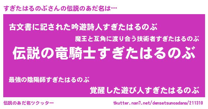 | 男性向けラノベタイトル風あだ名 | 『すぎたはるのぶの憂鬱』 |