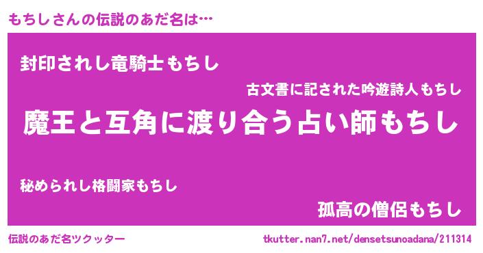 | 女子向けラノベタイトル風あだ名 | 『もちし恋絵巻』『もちしの玉の輿計画!』 |