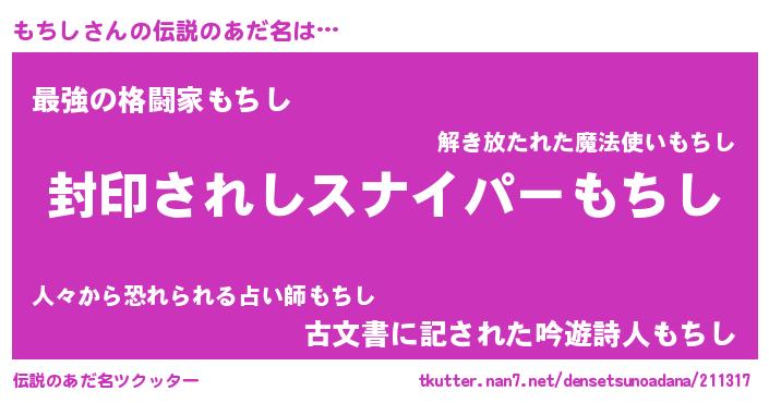 | ヒーロー風カッコイイあだ名 | 『スーパーモチシ』『究極戦士モチシ』 |