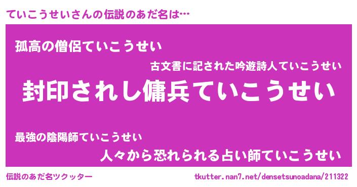 | 胡散臭い通販商品みたいなあだ名 | 『あなたにだけ特別に提供する限定10本のレアな日本酒…その名も「ていこうせい」』 |