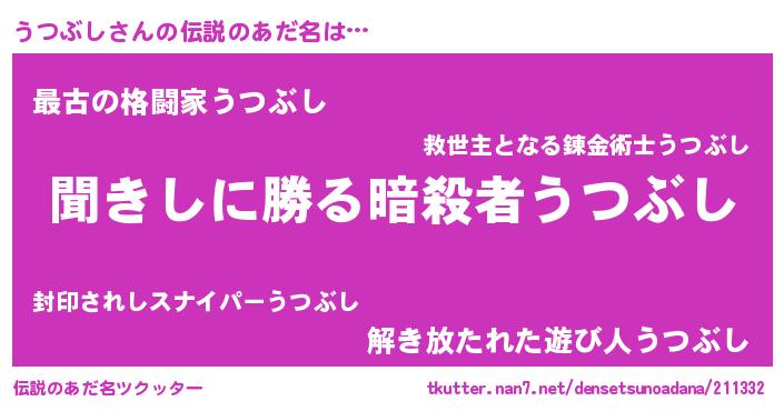 | 男性向けラノベタイトル風あだ名 | 『ウツブシスレイヤー』 |
