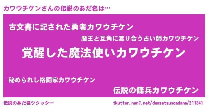 | ヒーロー風カッコイイあだ名 | 『炎刃騎士カワ』『ネオカワウチケン』 |