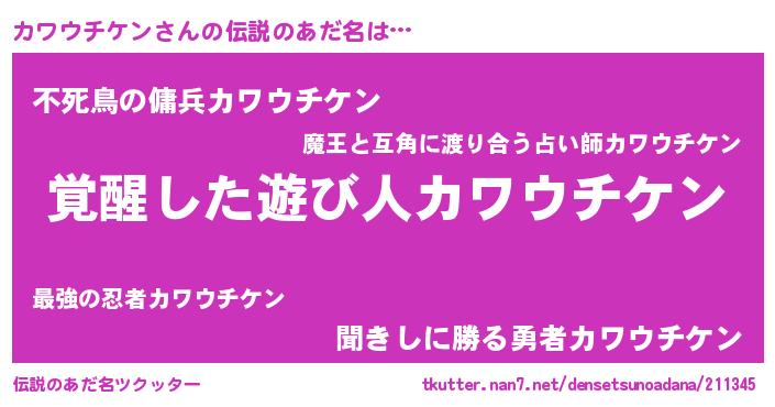 | ヒーロー風カッコイイあだ名 | 『炎刃騎士カワ』『スーパーカワウチケン』 |