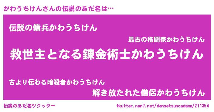 | 女子向けラノベタイトル風あだ名 | 『悪役かわうちけんに転生したようですが、知った事ではありません』 |