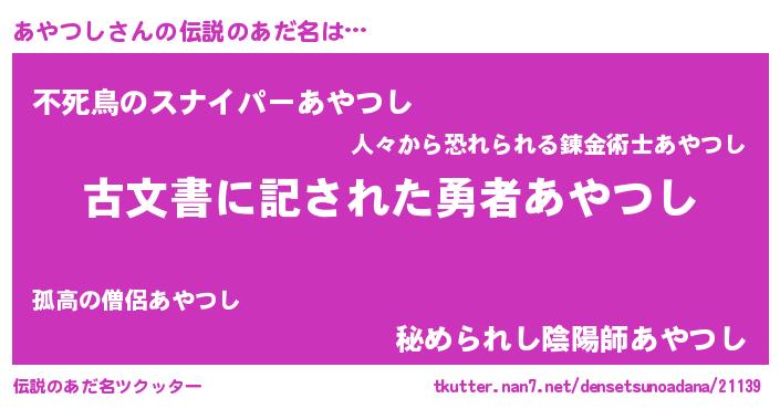 | 意味不明あだ名 | 『自称あやつし』『永久保存あやつし』 |