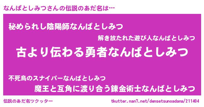 | 男性向けラノベタイトル風あだ名 | 『魔法科高校のなんばとしみつ』 |