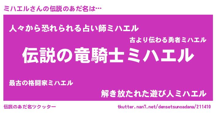 | 胡散臭い通販商品みたいなあだ名 | 『必ず成功するブレスレット…その名も「ミハエル」』 |