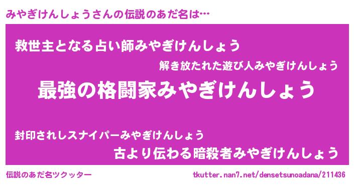 | ヒーロー風カッコイイあだ名 | 『仮面ミヤダー』『ネオミヤギケンショウ』 |